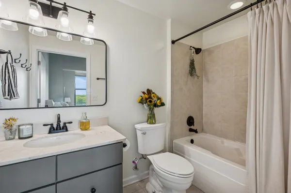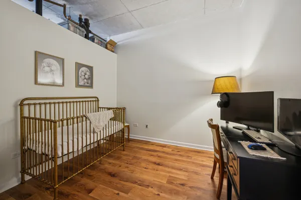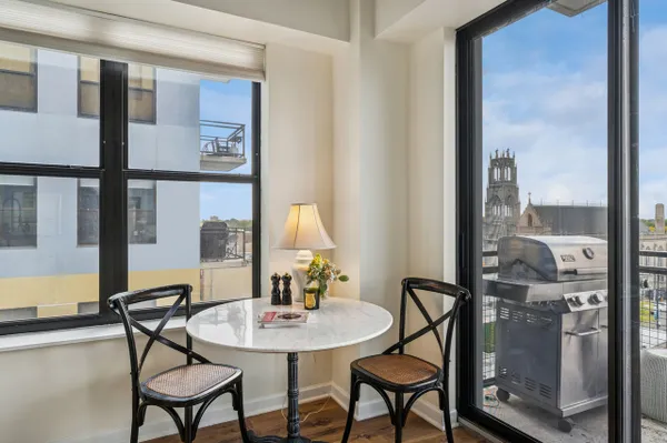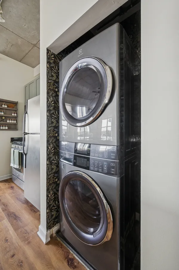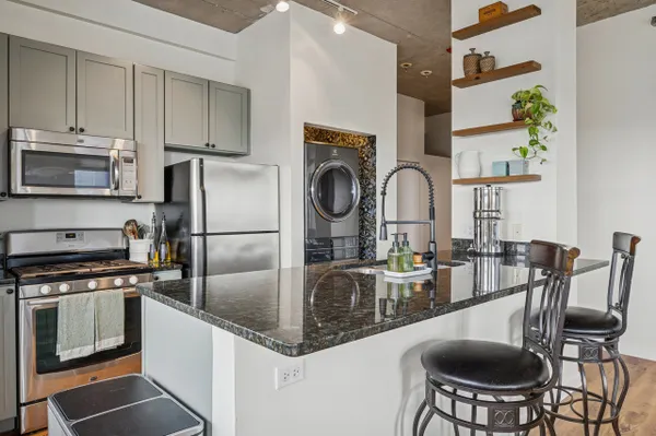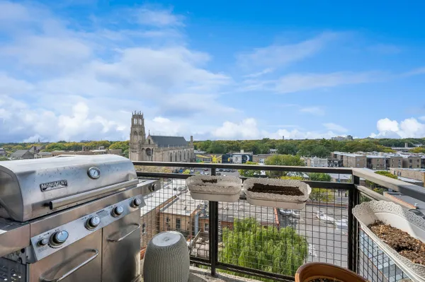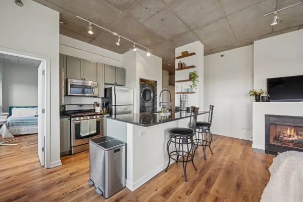 Edgewater modern loft living with sweeping west-facing views and incredible natural light! This corner unit boasts an open floor plan with 10' ceilings, oversized windows, and a cozy gas fireplace that anchors the living space. Step out to your private balcony for sunset views or entertain around the updated kitchen featuring tall custom cabinets, stainless steel appliances with a 5-burner stove, granite breakfast bar, and plenty of storage. The spacious primary suite includes a walk-in Elfa closet and a refreshed spa bath with new vanities, mirrors, and lighting, plus a soaking tub/shower. Brand-new luxury wide-plank vinyl floors run throughout, adding warmth and style. Additional highlights include in-unit laundry, a proper foyer, and a storage unit. The building offers a fitness center with lake views, a huge common rooftop deck, party room, dog run, on-site management, and a receiving room. Heated garage parking with private bike rack included. Conveniently located near Andersonville, Whole Foods, Jewel, Bryn Mawr restaurants, and just one block from the newly renovated Red Line.