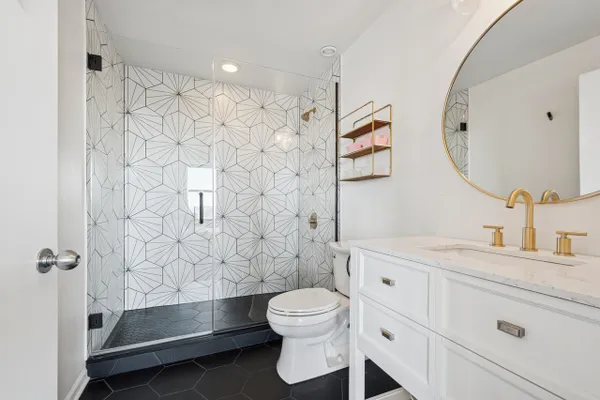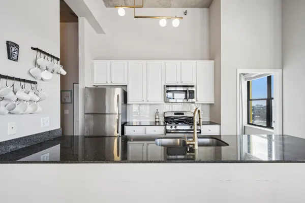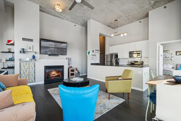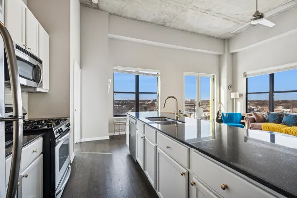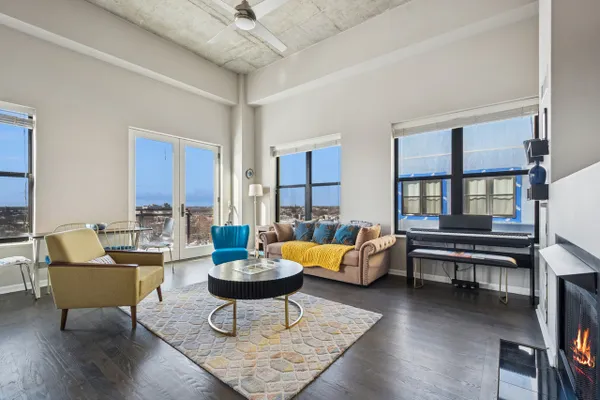 Edgewater penthouse loft featuring a private rooftop terrace with expansive city views. Fully refurbished in 2021, this stunning corner unit offers 12-foot ceilings and an open, split floor plan filled with abundant natural light. The chef's kitchen features cherry cabinetry, granite countertops, and stainless steel appliances. Hardwood floors run throughout the kitchen and living area.Enjoy summer evenings on the large private balcony or cozy winter nights by the gas fireplace. The spacious primary bedroom includes a recently updated en-suite bathroom with a walk-in shower. Generous sized second bedroom offers enough space to function as both a bedroom and a home office. The second bathroom is fully updated and features a tub/shower combination. In-unit laundry. Deep closets throughout the unit for ample storage space. Full-amenity building includes a fitness room, common rooftop deck, party room, dog run, on-site management, and receiving room. Prime location with easy access to shopping and dining in Edgewater and Andersonville, Bryn Mawr Red Line, Whole Foods, Jewel, Hollywood Beach, and more. Heated garage parking and one storage unit included.